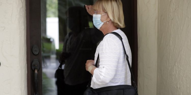 A census office worker strikes the door of a house in Winter Park, Florida, 2020.