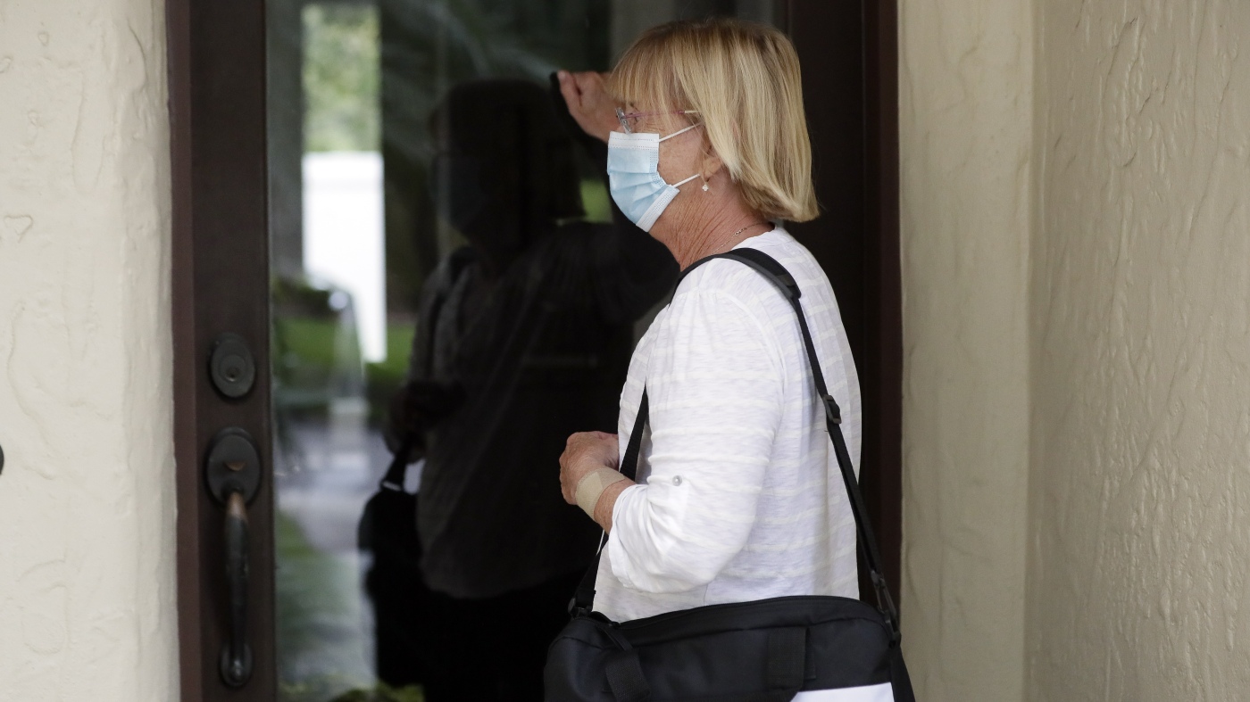 A census office worker strikes the door of a house in Winter Park, Florida, 2020.