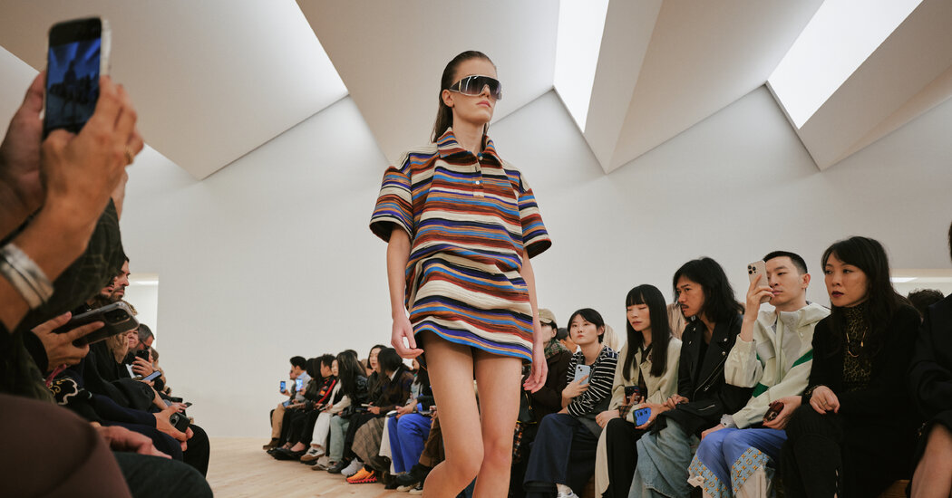 With jackets in jeans and jeans “in denim” which were actually treated in hand stretch leather to look like blurred cotton; Leather-striped leather mini-receptions, with stripes based on skin layers, such as plywood; And what looked like small Terry locking towel dresses that turned out to have been printed in 3D and hand painted so that they sparkle like the sun on the water. With transparent plastic pumps, under which socks of different colors could be worn, depending on the outfit: a shoe, many liners, just an excellent idea.