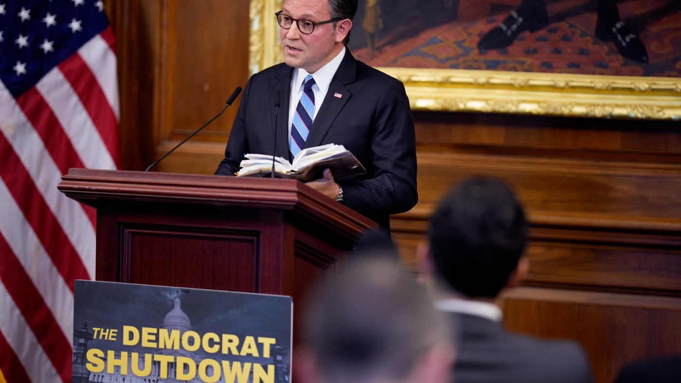House Speaker Mike Johnson (R-LA) reads a passage from his Bible during a press conference at the Capitol October 7 in Washington, DC. The government remains paralyzed after Congress failed to reach a funding deal last week.
