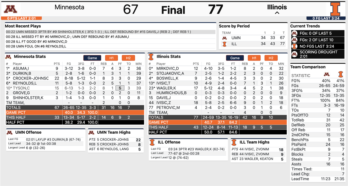 Brad Underwood called a timeout just 72 seconds into the game as Illinois fell behind 6-0 quickly behind two 3-pointers from Crocker-Johnson, but his team responded with an 8-0 run of its own to quickly catch up. After the teams traded leads several times, Illinois went cold, making only 1 of 14 shots in 6:31, including 11 straight misses of three, to allow Minnesota use a 12-2 run to take a 32-26 lead. But Petrovic entered the game and helped the Illini, along with the Ivisic twins, go on a 6-0 run and tie the game 34-34 at halftime.