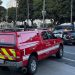 The man drives a car on the sidewalk outside the town hall, barricade on the inside