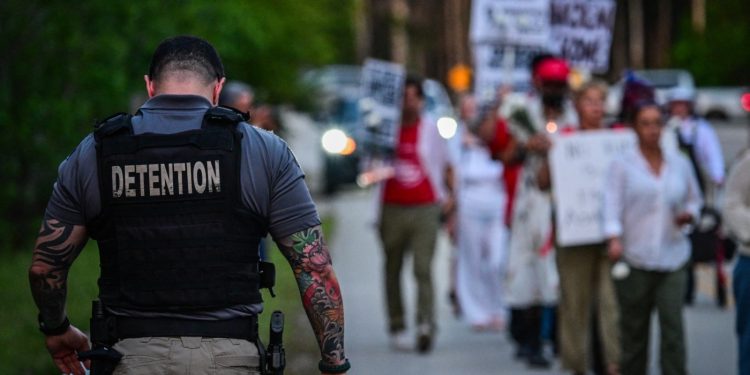 A correctional services agent works next to people holding candles, panels and flowers during a vigil outside the Krome detention center in Miami in May 2025, protesting against American immigration and customs custody and mass deportations.