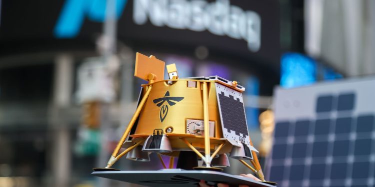 A model from Lander Blue Ghost Lander of Firefly Aerospace during the company’s initial public offer at Nasdaq MarcharsSite in New York, August 7, 2025.