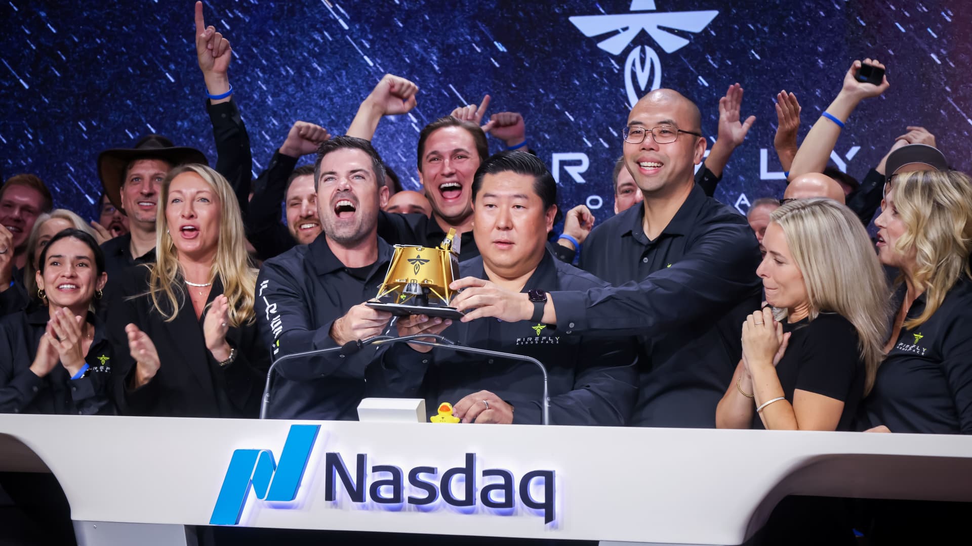 Jason Kim, CEO of Firefly Aerospace, center, during the company’s initial public offer at the Nasda Marketsite in New York, the United States, Thursday, August 7, 2025.