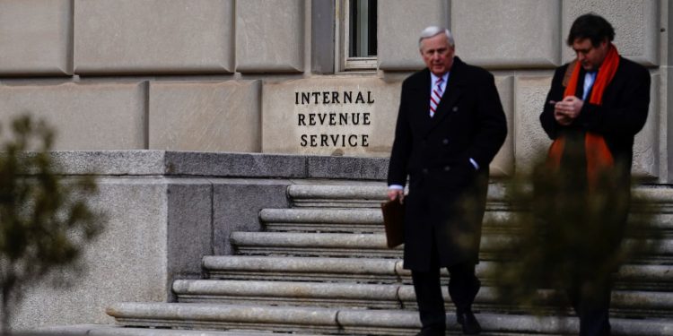 People exit the U.S. Internal Revenue Service (IRS) building in Washington, DC, February 20, 2025.