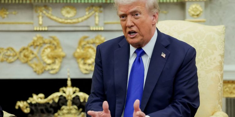 U.S. President Donald Trump speaks as he and Prime Minister of Canada Mark Carney (not pictured) meet in the Oval Office of the White House in Washington, DC, U.S., October 7, 2025.