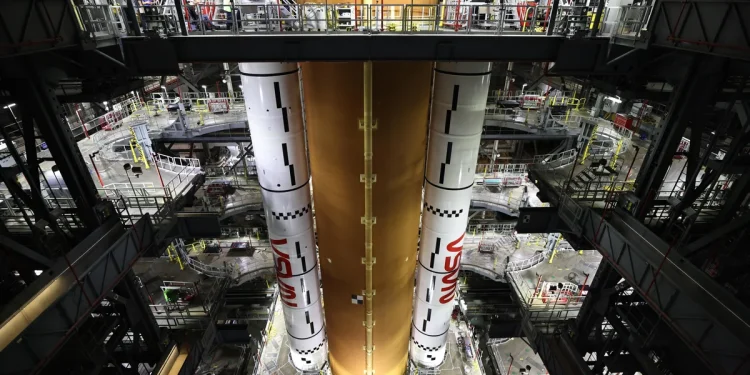 NASA’s massive 322-foot-tall Space Launch System rocket, the world’s most powerful operational booster, will be carried out of the cavernous Vehicle Assembly Building early Saturday atop an upgraded Apollo-era tracked transporter. Including at least one stop along the way, the 4-mile trip to the platform should take eight to ten hours.
