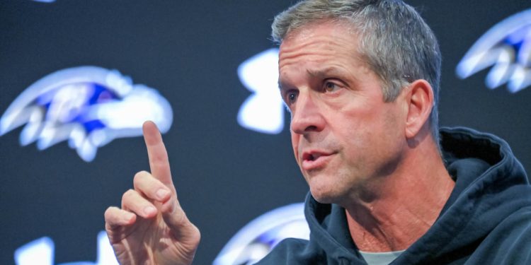 Baltimore Ravens head coach John Harbaugh participates in a press conference at the team’s practice facility in Owings Mills, Maryland on December 29, 2025.