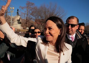 Venezuelan opposition leader and Nobel Peace Prize winner María Corina Machado greets supporters outside the White House following a meeting...