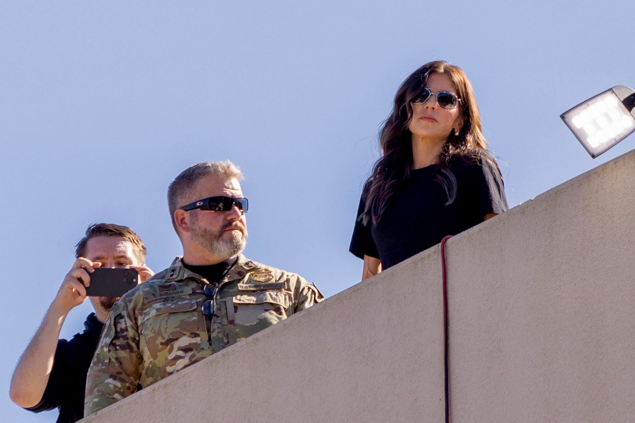 Noem briefly appeared on the roof around 1:30 p.m. to survey the area, and a handful of protesters heckled her.
