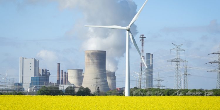 Wind turbines stand next to the Neurath coal-fired power plant on April 15, 2024, in Ingendorf, Germany.