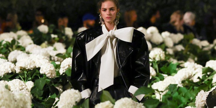 Guests had been told the doors closed 10 minutes before the show was scheduled to start, and they obediently filed in early, seizing the extra moments to snap selfies against the scenery until darkness fell. Then they sat down and looked around. Then they started to squeeze each other’s legs. Then Madonna arrived 40 minutes after the appointed time with her daughter Lourdes and a pussycat blockbuster blouse, black leather motorcycle jacket and black leather pencil skirt appeared between the hydrangeas. It was YSL, circa the 1970s and early ’80s, when it straddled the fine line between spunk and elegance.