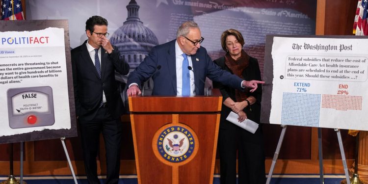 U.S. Senate Minority Leader Chuck Schumer (D-NY) speaks next to Senator Brian Schatz (D-HI) and Senator Amy Klobuchar (D-MN) during a press conference at the U.S. Capitol on the third day of a partial government shutdown, on Capitol Hill in Washington, DC, United States, October 3, 2025.