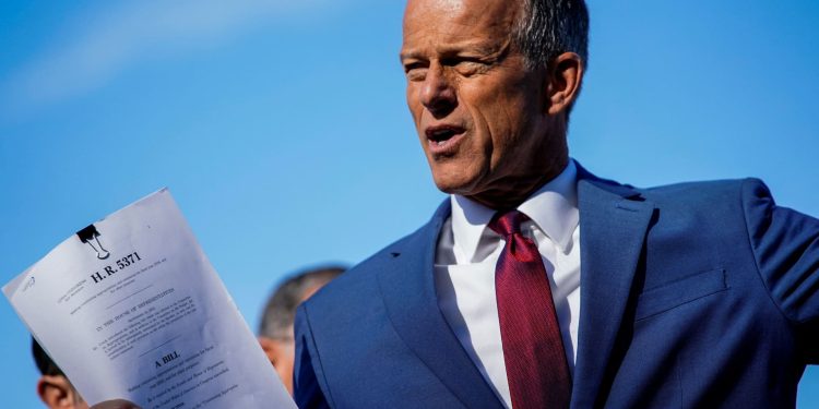 U.S. Senate Majority Leader John Thune (R-SD) holds a copy of the Continuing Appropriations and Extensions Act as he speaks during a press conference, accompanied by House Speaker Mike Johnson (R-LA) and other Republican colleagues, on the first day of a partial government shutdown, at the U.S. Capitol, in Washington, DC, U.S., October 1 2025.