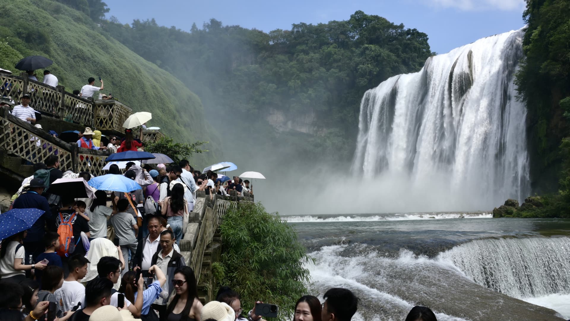 Tourists visit the Huangguoshu waterfall of "Monkey King" renown in the Chinese province of Guizhou on October 5, 2025, at…