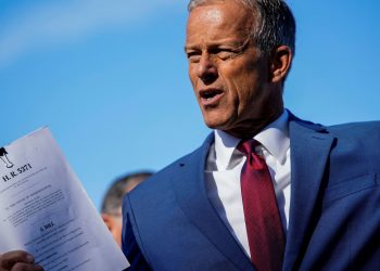 U.S. Senate Majority Leader John Thune (R-SD) holds a copy of the Continuing Appropriations and Extensions Act as he speaks ...