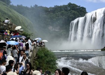 Tourists visit the Huangguoshu waterfall of "Monkey King" renown in the Chinese province of Guizhou on October 5, 2025, at ...