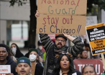 People march during the Illinois Coalition for Immigrant and Refugee Rights' "Chicago Says No Trump No Troops" protest Saturday, Sept. ...