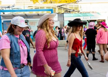 People line up to take a photo in front of a mural depicting Chappell Roan before his concert in Kansas ...