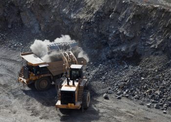 A wheel loader operator fills a truck with ore at the MP Materials rare earth mine in Mountain Pass, California, ...