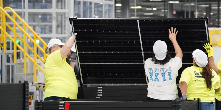 Employees work on solar panels at the Qcells solar energy manufacturing plant in Dalton, Georgia, March 2, 2023.