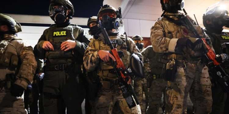 Federal agents, including members of the Ministry of Internal Security, Border Patrol, and the police, are trying to keep the demonstrators outside an immigration and customs center in downtown downtown on October 5, 2025 in Portland, Oregon.