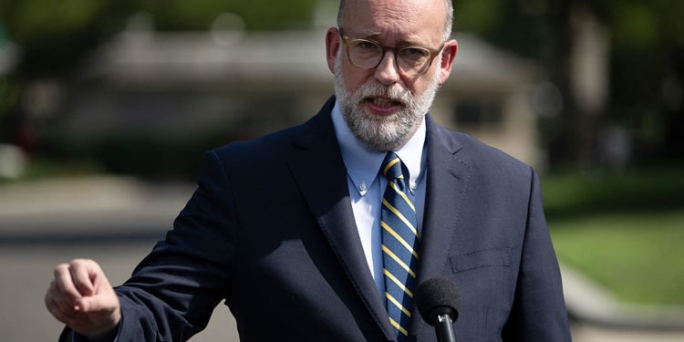 The Director of the American Management and Budget Office (OMB) Russell (Russ) Vought speaks to journalists outside the west wing of the White House on July 17, 2025 in Washington, DC.