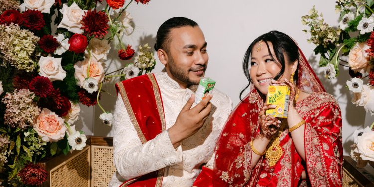 The celebration was a tapestry of their Banglades and Chinese cultures. Their four -feet long cake was made by a local Bangladaise bakery, oven Corners Co., and was decorated with dragon, guava, lychee and flowers. Their wedding favors were fans woven by Bangladais and Chinese fans. And the night ended with Trivia matches where the winners received money in red Chinese envelopes, followed by a truck of ice cream Mister Sofee.