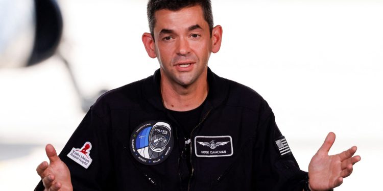 Commander Jared Isaacman of Polaris Dawn, a private human spaceflight mission, speaks during a press conference at the Kennedy Space Center in Cape Canaveral, Florida, United States, August 19, 2024.