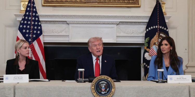U.S. President Donald Trump, along with U.S. Attorney General Pam Bondi and U.S. Secretary of Homeland Security Kristi Noem, participate in a panel discussion on “Antifa,” an anti-fascist movement that he designated a domestic “terrorist organization” by executive order on September 22, at the White House in Washington, DC, October 8, 2025.