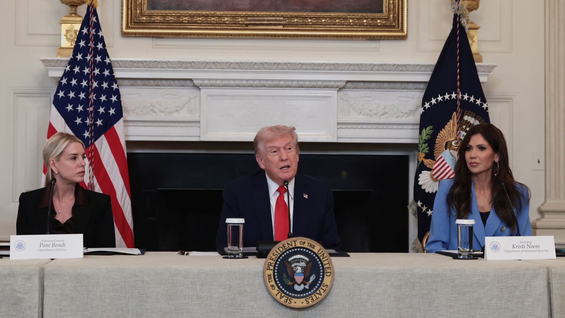 U.S. President Donald Trump, along with U.S. Attorney General Pam Bondi and U.S. Secretary of Homeland Security Kristi Noem, participate in a panel discussion on “Antifa,” an anti-fascist movement that he designated a domestic “terrorist organization” by executive order on September 22, at the White House in Washington, DC, October 8, 2025.